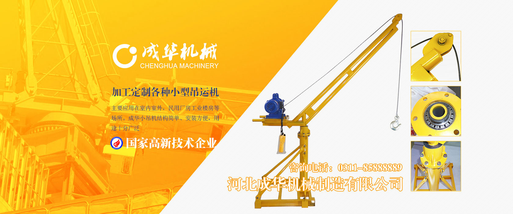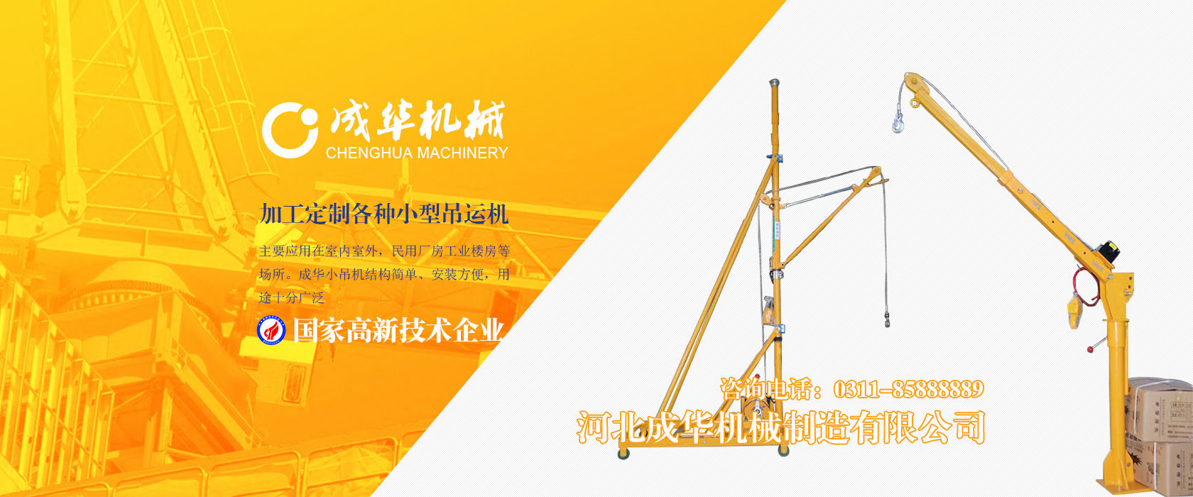 河北成華機(jī)械制造有限公司為國家高新技術(shù)企業(yè),旗下吊運(yùn)機(jī)制造廠是家專業(yè)生產(chǎn)制造便攜式小吊機(jī)、手提式小吊機(jī)附屬工廠,我廠產(chǎn)品主要應(yīng)用在室內(nèi)室外,民用廠房工業(yè)樓房等場所。成華小吊機(jī)結(jié)構(gòu)簡單、安裝方便,用途十分廣泛,小吊機(jī)產(chǎn)品被廣泛應(yīng)用于機(jī)械制造、電子、汽車...